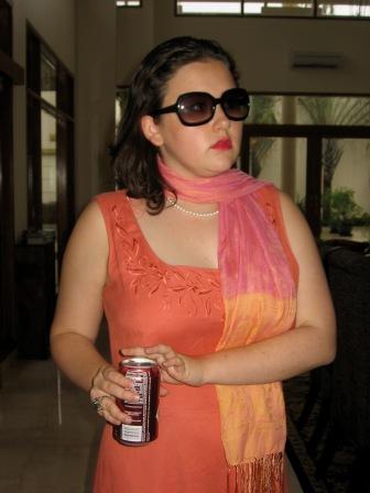 | Nana's birthday cake, the day she arrived in Jakarta. Arianna decorated it. Annaliese in her Jackie O sunglasses. Not sure of the occasion. Take note of the Dr. Pepper. That's a $2 imported Dr. Pepper. But not a Dublin Dr. Pepper. |