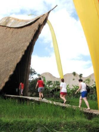 | We went to a silver-jewelry factory in central Bali -- the factory is known for being conscientious about the culture, the environment, and its employees. The ladies below (Alissa, Arianna, and Annaliese) are entering the architecturally unique showroom. |