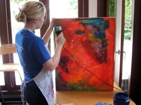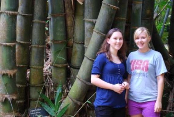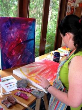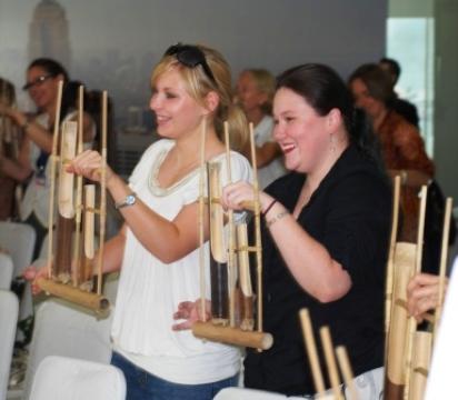 | While in Jakarta, the college girls had a bit of leisure time, so they took up some artistic pursuits (when they weren't shopping). They attended a meeting of the Indonesian Heritage Society that culminated in a bit of music-making on the traditional bamboo instrument called the "anklung." (You flibble that bottom bit back and forth furiously and makes a lovely, solid wind-chime sounding tone.) They also joined Christopher for a day of abstraction in the art studio. |