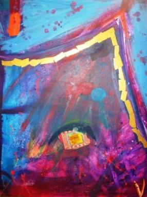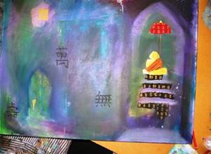 | At the far left is a detail from Annaliese's work, which she did NOT call "A New House for the World 2," although she could have. The piece above is one of the two paintings Barbie created. |