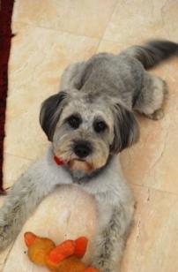 | This is Banjira. She is a dog of some sort. She does good-dog things and bad-dog things. She has a variety of chewable play- toys and will often attempt to fit them all in her mouth simultaneously. They don't all fit. |